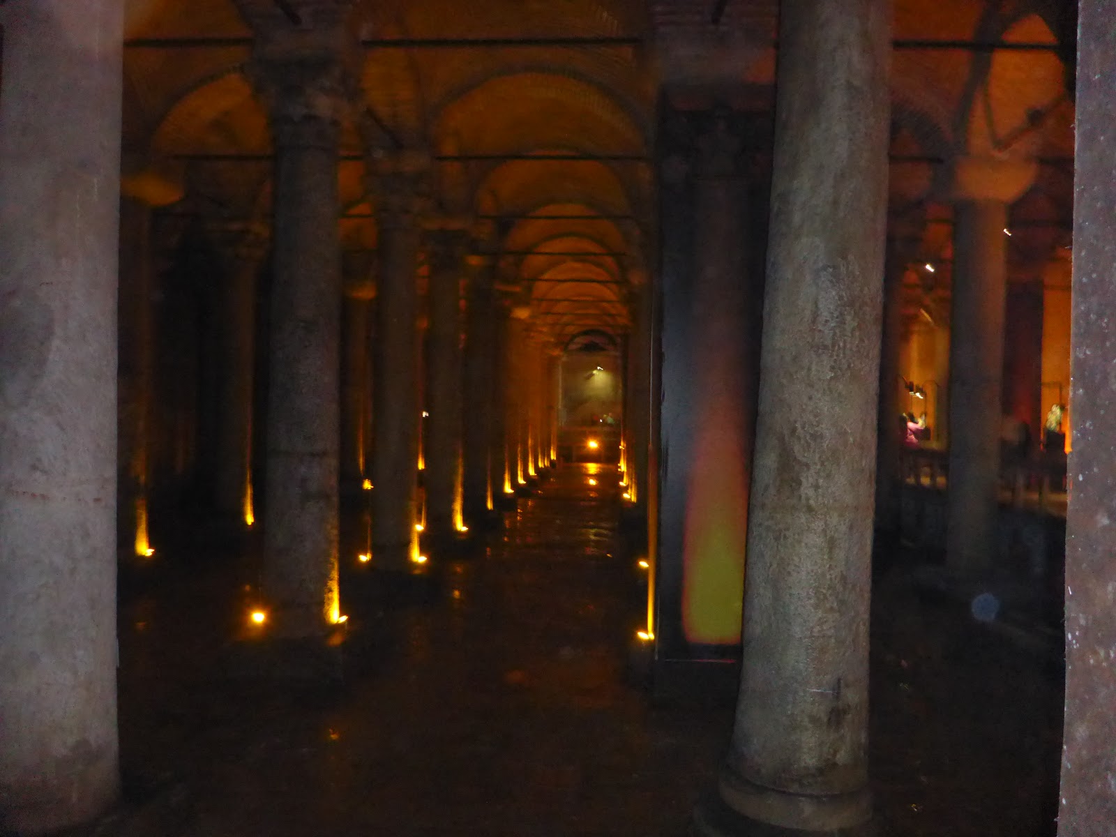 La citerne basilique, construite durant la période byzantine. 140 mètres de longueur, 70 mètres de largeur - 336 colonnes, en 12 rangées de 9 mètres de haut. Impressionant. L'eau y coule encore mais la citerne n'est plus utilisée. |
